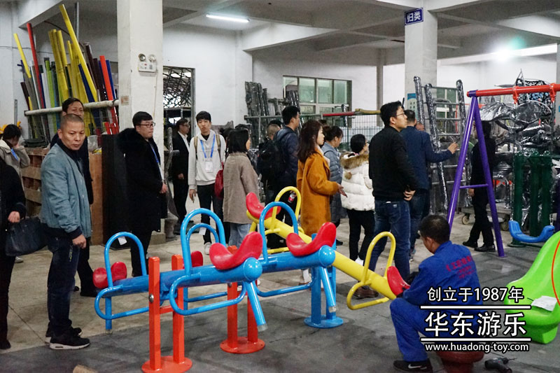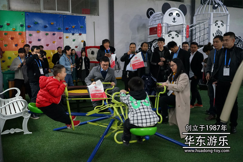 參觀人員體驗華東游樂生產(chǎn)的手動轉(zhuǎn)椅
