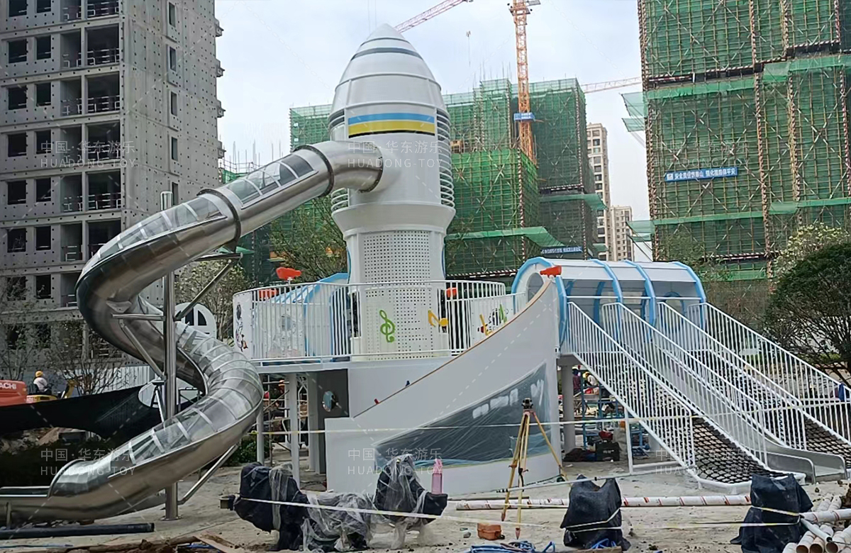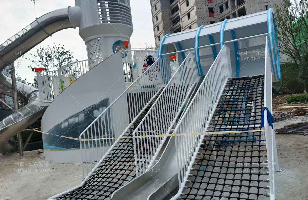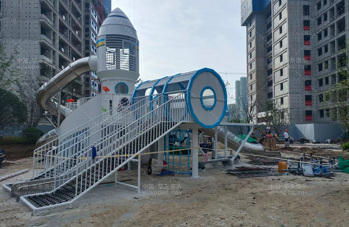 安徽省亳州市渦陽(yáng)縣榮徽上河郡選用的是華東游樂(lè)自主研發(fā)和生產(chǎn)的以航天飛機(jī)為主題的大型非標(biāo)定制的游樂(lè)設(shè)備,是一款具備了攀爬網(wǎng)、攀爬梯、旋轉(zhuǎn)滑筒、兒童搖搖樂(lè)為一體的綜合性兒童游樂(lè)場(chǎng)。