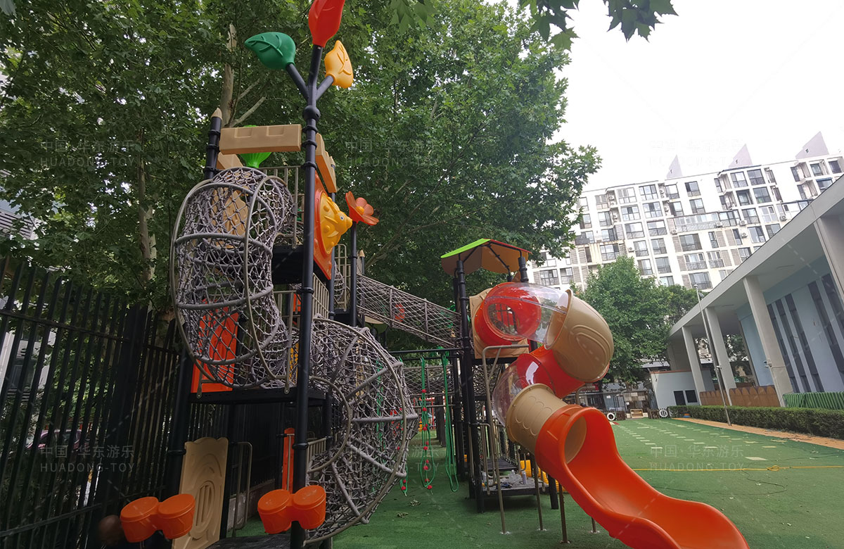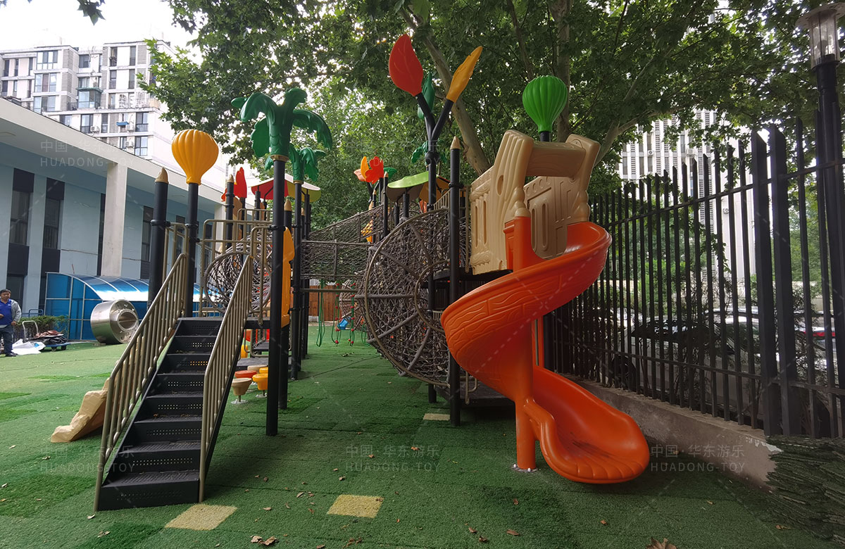 北京市朝陽區(qū)管莊忠德幼兒園選用的是華東游樂自主研發(fā)和設(shè)計的大自然系列組合滑梯,該滑梯是一款具備了攀爬網(wǎng)、鉆洞、滑梯、叢林拓展、拍拍鼓、攀爬墻、固定踏踏車、平衡樁等功能為一體的綜合性 游樂設(shè)備,能夠很好的鍛煉小朋友的全面發(fā)展。