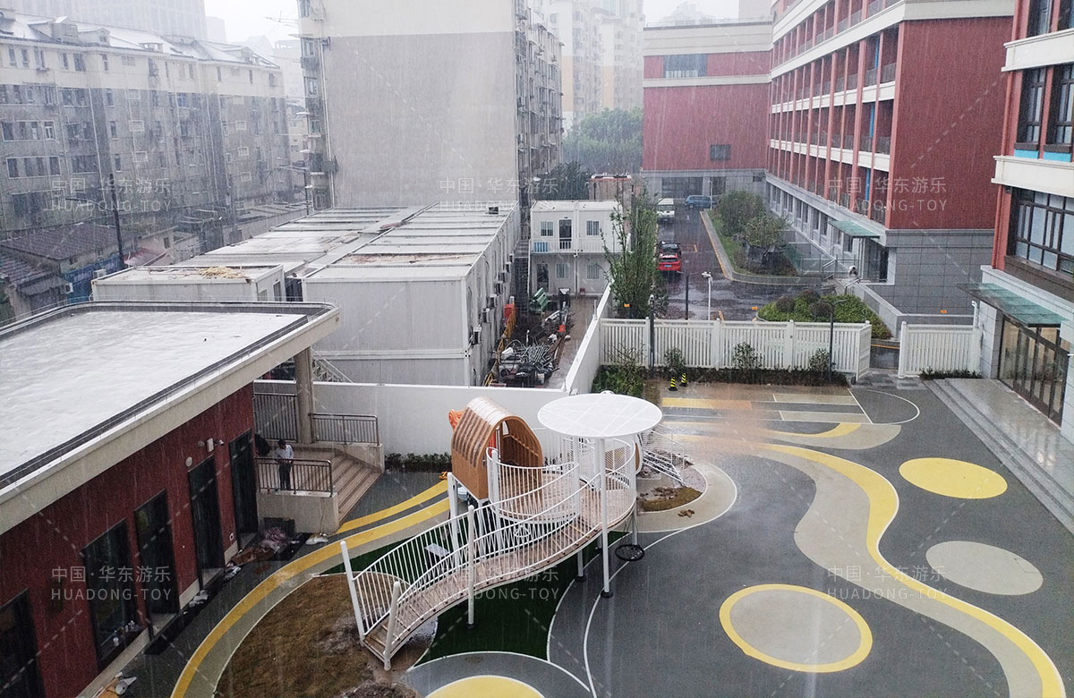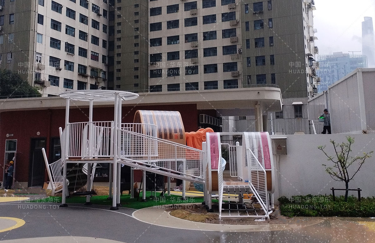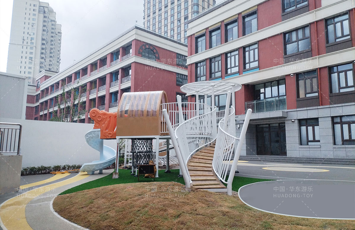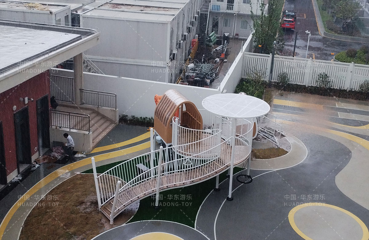 上海市虹口區(qū)東余杭路幼兒園是一個專業(yè)性的學(xué)前教育機構(gòu),此次選用的是華東游樂自主研發(fā)和設(shè)計的非標(biāo)定制系列的游樂設(shè)備,該游樂設(shè)備具備了攀爬網(wǎng)、鉆洞、秋千、滑筒、旋轉(zhuǎn)走梯等功能,深受孩子們的喜歡,不僅僅豐富了孩子們的校園生活,也為老師的教學(xué)提供了幫助。