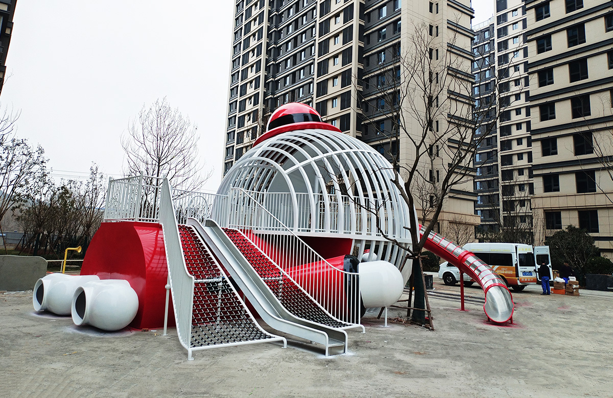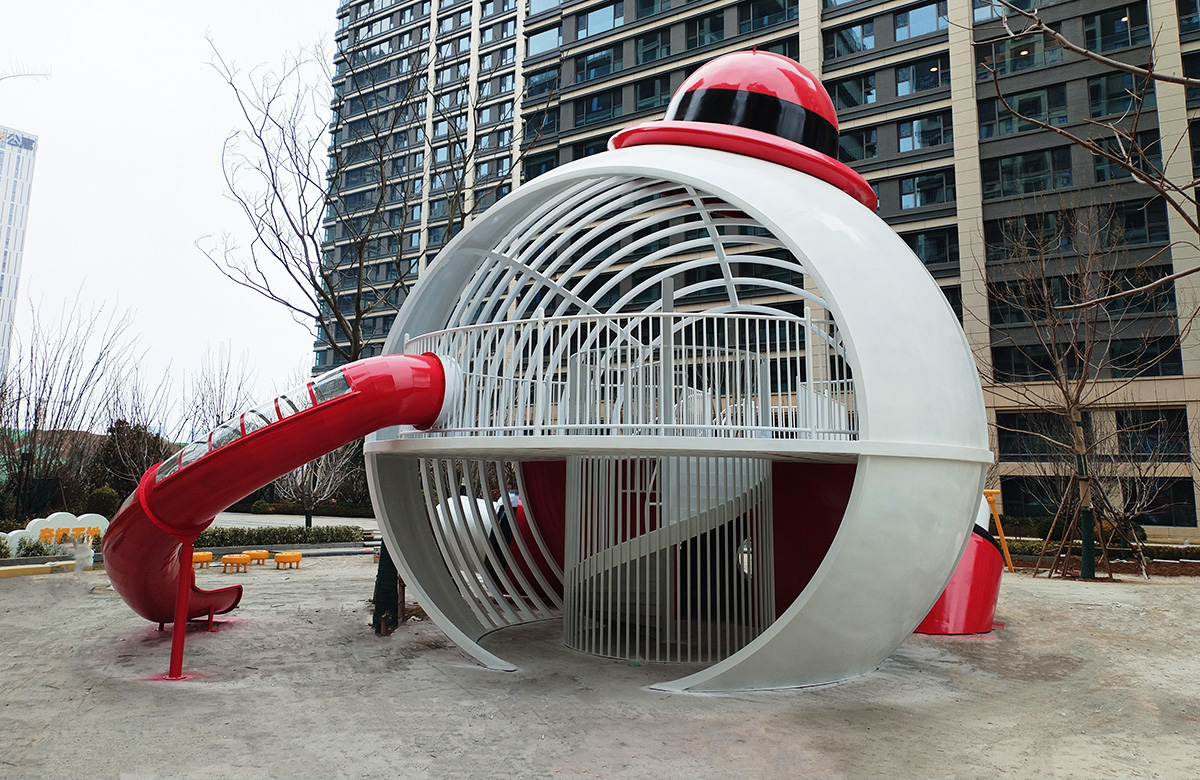 山東省銀豐玖璽城崇和院選用的是銀豐地產(chǎn)旗下的IP主題人物 銀小豐 為主題設計的主題性游樂設備,該設備具備了攀爬網(wǎng)、不銹鋼滑梯、鉆洞等功能,同時為了更好的為生活在小區(qū)的人們提供方便和服務,我們還設置了組合秋千、蹺蹺板、搖搖樂地蹦床等游樂設備,讓整個小區(qū)的生活變得更加的充滿生機與活力。
