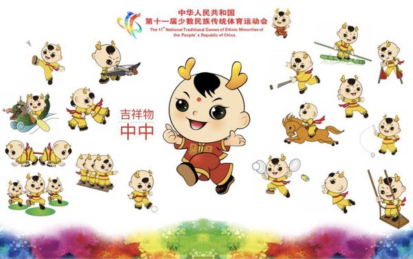 作為此次運(yùn)動(dòng)會(huì)的吉祥物“中中”是龍娃,穿著中國傳統(tǒng)服飾。胸前裝飾圖案取自鄭州出土的商代經(jīng)典青銅器“商鼎”,體現(xiàn)舉辦地鄭州深厚的歷史文化積淀。“中”是河南的特色方言,鄭州自古就有“天地之中”的美譽(yù)。在河南人民的生活語言里,“中”字表達(dá)的意思是肯定、鼓勵(lì)和贊譽(yù),飽含著河南人民對(duì)運(yùn)動(dòng)會(huì)圓滿成功的祝愿。