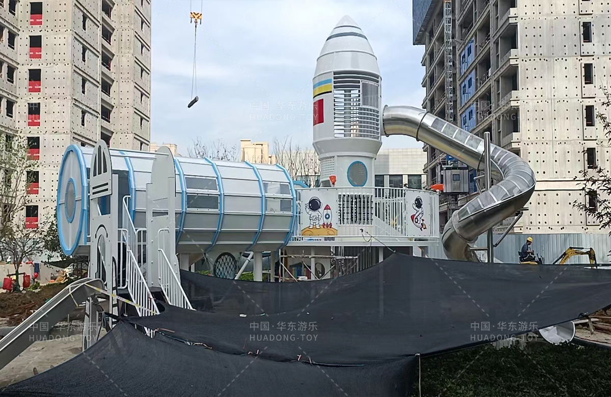 安徽省亳州市渦陽(yáng)縣榮徽上河郡選用的是華東游樂(lè)自主研發(fā)和生產(chǎn)的以航天飛機(jī)為主題的大型非標(biāo)定制的游樂(lè)設(shè)備,是一款具備了攀爬網(wǎng)、攀爬梯、旋轉(zhuǎn)滑筒、兒童搖搖樂(lè)為一體的綜合性兒童游樂(lè)場(chǎng)。